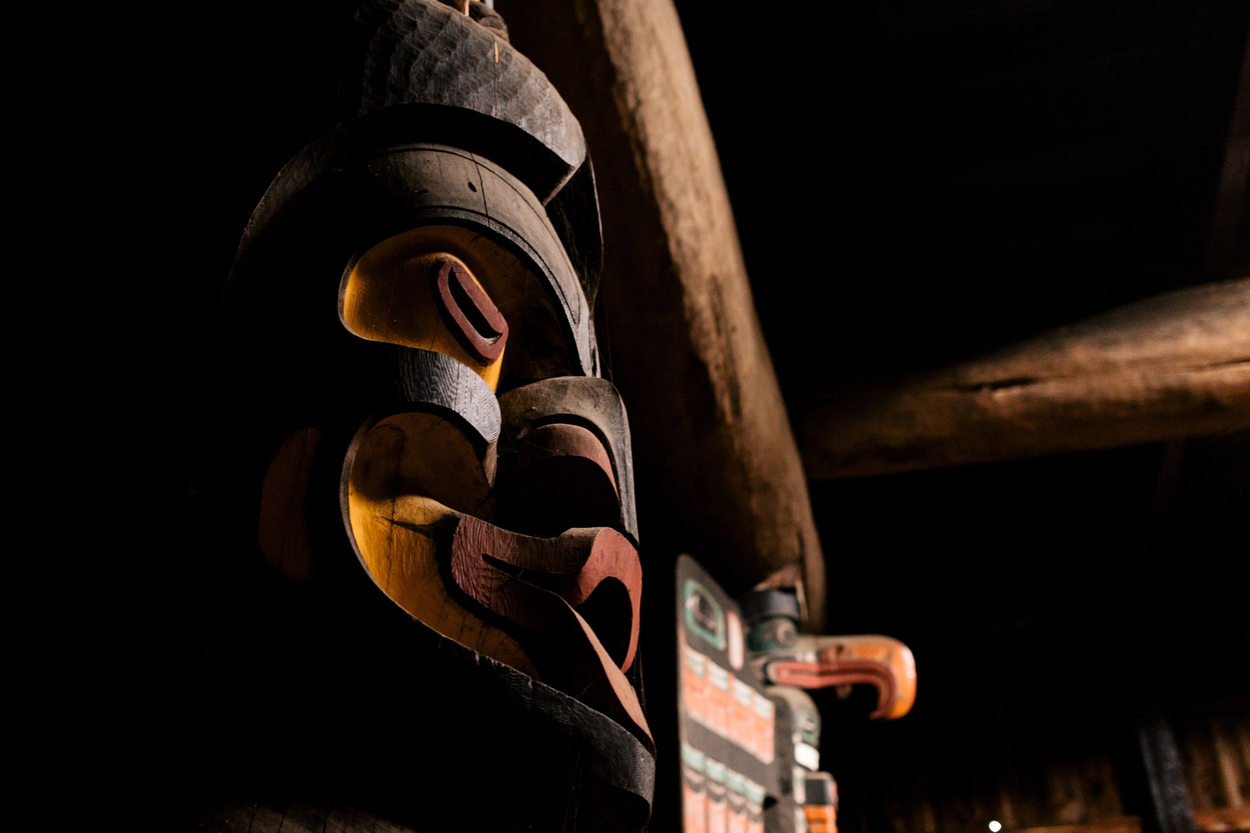 At the entrance of the U’mista Cultural Centre stand the striking Guardian Poles Nułamał and Nan, carved by Marcus Alfred alongside youth collaborators Garrett Cranmer, Eddie Walkus, Harry Isaac, Aubrey Johnston Jr., and Alan Hunt.